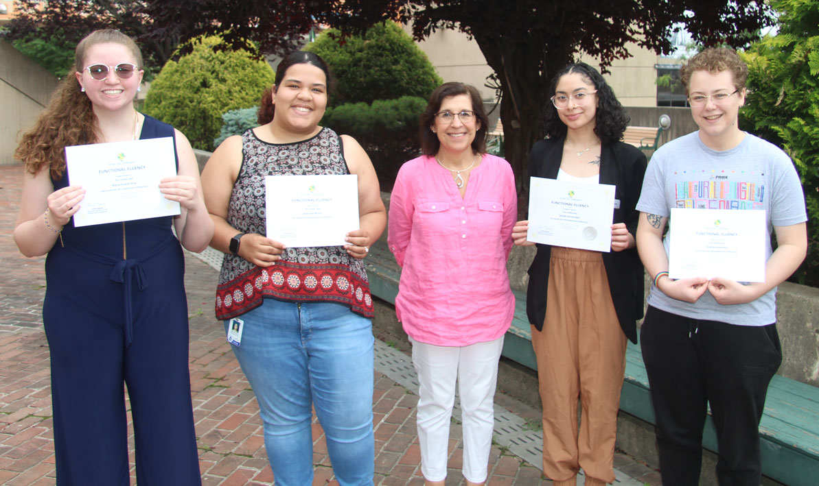 Mary Grace Zina ’22, Alannah Brunt, Jessiah Fernandez ’22, and Charlie Summers (pictured l-r with HCC Spanish professor Monica Torregrosa, center) were among the first 10 HCC students to receive their Global Seal of Biliteracy credentials. The Seal of Biliteracy is a professional recognition of either functional fluency or working fluency in English and Spanish. All 10 were students in Torregrosa’s Intermediate Spanish classes during the 2021-2022 academic year. The four-plus hour proctored test measures reading, writing, speaking and listening skills in the second language (Spanish) and scores them according to national standards. Students earning a 5 (Intermediate Proficiency) or higher in each of the skills qualify for the Functional Proficiency Seal. “It’s a skills-based test, not content based, and it is very intense,” Torregrosa said earlier this month after handing out Global Seal of Biliteracy certificates to her students. “The Global Seal of Biliteracy is a professional credential they can use on their resumes and that gets embedded in their LinkedIn profiles. It’s not for college credit, but for employment.”