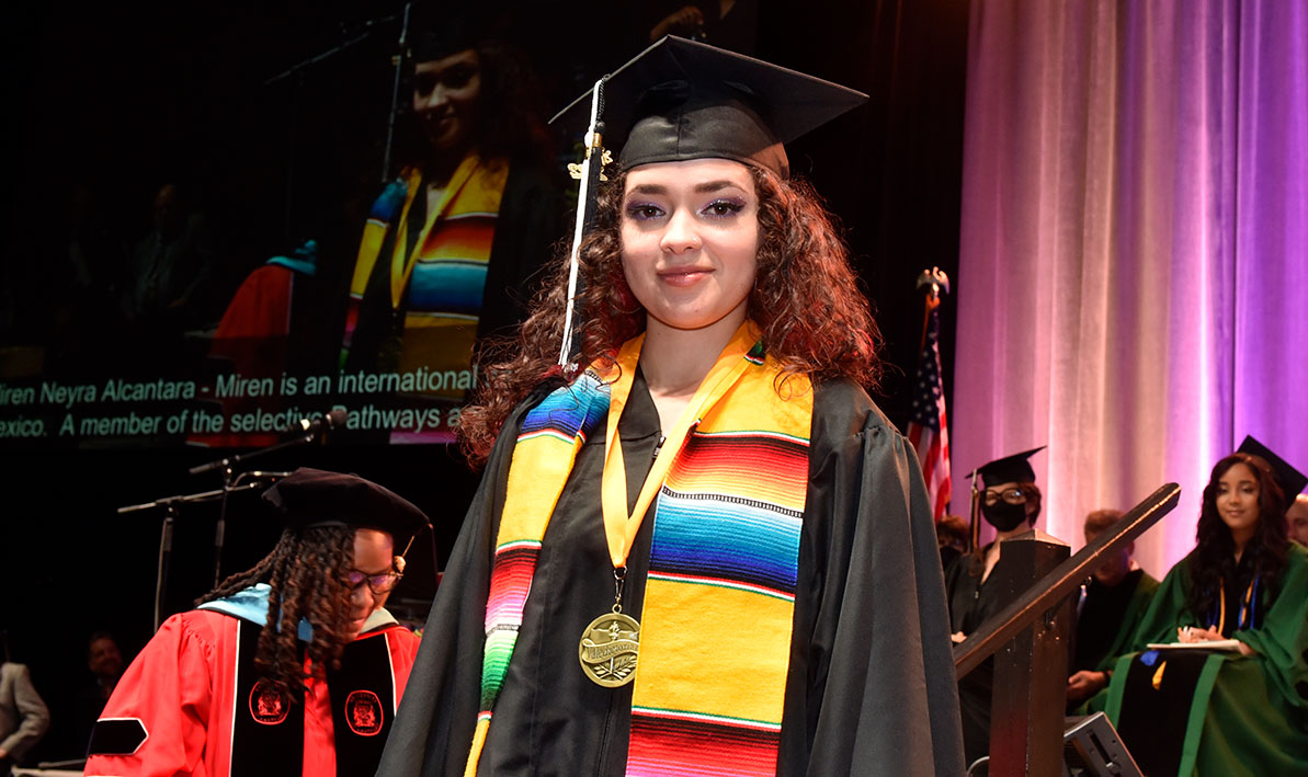Miren Neyra Alcántara ’22 was awarded a Jack Kent Cooke Graduate Scholarship and has been accepted into the Ph.D. program in public history at the University of Massachusetts. “While this wonderful news comes as no surprise to those of us who have known and worked with Miren since her time as an HCC student, it is a morale-boosting reminder that the work we do here does indeed transform students’ lives,” said HCC History Professor Mark Clinton. Alcántara majored in Latinx Studies at HCC and represented HCC during the Mass. Dept. of Higher Ed's "29 Who Shine" celebration in May 2022. In 2024, she graduated from Smith College with her bachelor’s degree in Latin American Studies with a concentration in archives. In spring of 2022, she received a Cooke Foundation Undergraduate Transfer Scholarship, the largest private scholarship in the nation for community college students transferring to four-year schools. She was one of just three students in Massachusetts selected for the Cooke transfer scholarship that year and one of 100 in the United States. “The Integrative Learning Department is excited to hear about her acceptance into the Ph.D. program and her well-earned JKC Graduate Scholarship,” said Integrative Learning Director Irma Medina, one of Alcántara’s HCC advisors. “This is truly life changing. Miren's journey, like that of many of our students, exemplifies how what we do – setting high expectations and applying impactful practices cultivated at HCC – really matters.” Alcántara visited HCC earlier this month to share her success story with students. “We are definitely celebrating Miren's accomplishment with great pride,” said Medina. PHOTO: Miren Neyra Alcántara at HCC Commencement in 2022.