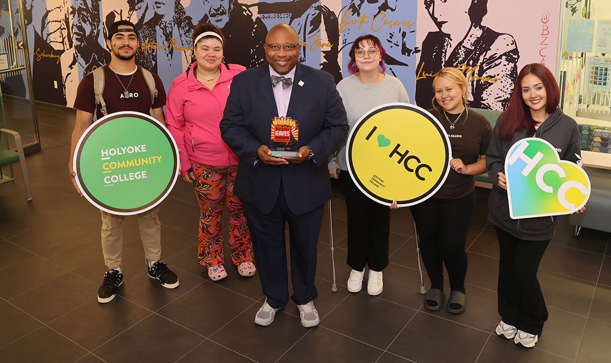 Holyoke Community College has been selected as the Best College or University in the Pioneer Valley in the Springfield Republican / MassLive 2025 Reader Raves poll. This was the third year in a row that Republican and MassLive readers voted HCC as their number one choice. "We’re honored,” said President George Timmons. “It makes me very proud. HCC is an extraordinary institution. What makes us different is our unapologetic commitment to our mission, vision, and values. Our mission is to Educate, Inspire, and Connect, and we do that in a way that is true to our values of Innovation, Collaboration, Inclusion, and Kindness, which are grounded in Trust.” HCC also received the number one spot as Best Two-Year College for 2024 for the 11th year in a row in the Daily Hampshire Gazette's annual Readers Choice Awards. PHOTO: HCC President George Timmons celebrates HCC's Reader Raves recognition with students outside El Centro.