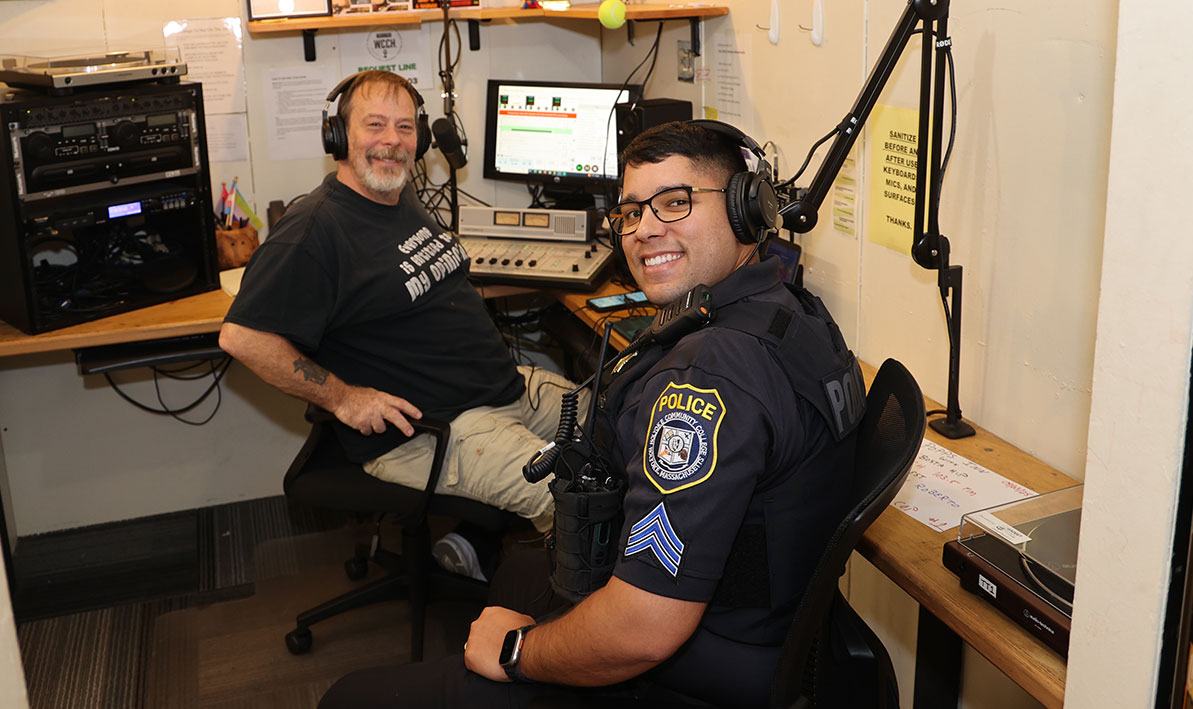 You can call him Popps, or you can call him by his other radio name, DJ Bustahip. He answers to both, or to his legal name, Todd Therrien, a 60-year-old HCC student, CMTA major, stand-up comedian, and host of not just one, but two shows every week on the HCC radio station, WCCH 103.5 FM: “Popps Inn with DJ Bustahip,” Wednesday mornings at 10, and the “Night Shift with Popps, Saturdays 10 to midnight. On the Night Shift, Therrien plays more music, but not “pop,” he says. “I play a lot of local music, a lot of local hip hop artists.” Popps Inn is more of an interview show, with Therrien inviting members of the Holyoke Community College faculty and staff in to talk about what they do. “I love it that community is our middle name. I’m trying to let the community here and the community outside of campus know what’s going on.” Earlier this month, Therrien introduced a new monthly segment of Popps Inn, “Coffee with a Cop.” His first guest was recently promoted Sergeant Ruben Roberto, who asked to come on to talk about the HCC police department’s new initiatives. “We trying to do all we can to engage with the HCC community and talk about our vision,” Roberto said. “I’m doing anything I can to let people know that I’m here, and we want to be transparent.” Therrien said he's calling it “Coffee with a Cop,” in part, because he likes the alliteration, but there’s more to it than that. “We want to use the word cop, but not as a negative,” he said. “We want it to be something positive.” PHOTO: Todd Therrien (a.k.a. Popps, a.k.a. DJ Bustahip) in the WCCH broadcast booth with HCC Police Sergeant Ruben Roberto.