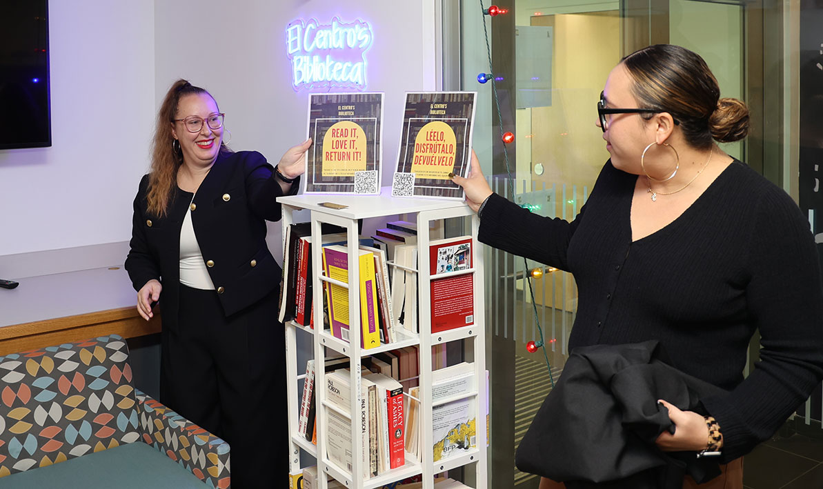 The staff at El Centro recently unveiled their own little free library thanks to a donation of books from adjunct theater professor Nicole Young-Martin, founder, producer and host of the “Black Writers Read” podcast and video series. During one of El Centro’s regular Monday morning Café con Leché breakfast events, Director Julissa Colón and El Centro Student Success Counselor Naiomi Robles pulled the black veil off a tall rotating shelving unit and flicked a switch on the wall lighting up a blue neon sign that says, “El Centro’s Biblioteca.” “It’s one of the dreams I’ve had from the beginning of El Centro and that my beautiful team has talked about and cultivated, but we never actually got it together,” said Colón. Until now. “This is about giving our students access to more materials that are, hopefully, stories and information that feed their soul – about themselves and about their communities,” she said. Robles, who put the library together, said the top shelf will be a collection of curated books specific to special occasions or themes, such as, currently, Latinx Heritage Month. There are also sections for fiction, nonfiction and poetry. Students can check out books with a QR code scanner and – coming soon – watch video reviews from their classmates. To the question, is it a free library or a lending library, the answer, Colón said, is both: “We want you to take a book and bring it home. If it feeds your soul and you love it, keep it, but if you want somebody else to share it, please bring it back.” And, Colón said, “it turns!” PHOTO: Director Julissa Colón and Student Success Counselor Naiomi Robles unveil El Centro's new little library.