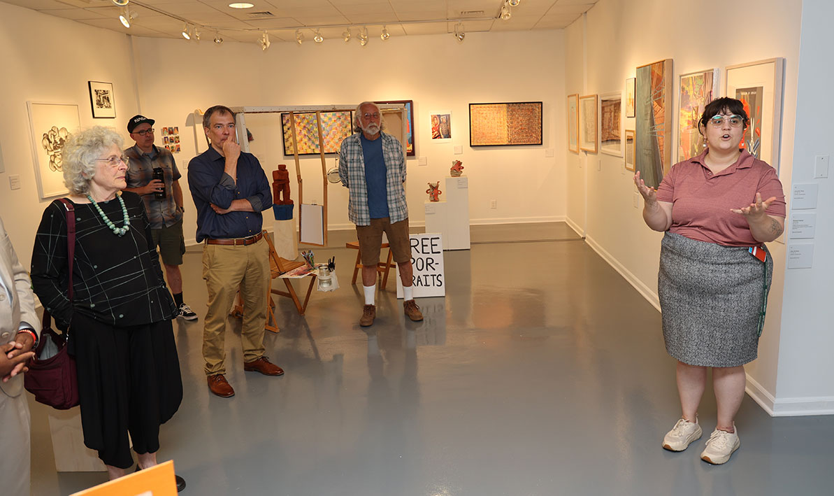 “What happens when the art made in classrooms meets the wider world?” That was the question WHMP radio host Donnabelle Casis posed to listeners at the beginning of a recent broadcast. Her answer: The Taber Art Gallery at Holyoke Community College, the subject of her Sept. 5 interview with gallery director Rachel Rushing. During a guest appearance on Casis’s Art Beat show, they talked about “Milestone: 25 Years of the Taber Art Gallery,” a 25th anniversary retrospective showcasing the work of the HCC Visual Art faculty, past and present. “Art professors focus on teaching students how to create while galleries offer an in-person, real-life context for what happens to art after it is created,” Rushing said in another recent interview. “Spaces like the Taber Art Gallery provide the visceral experience of engaging with professional artists modeling pathways forward that students can pursue. 'Milestone' celebrates this interconnection by looking at the very artists HCC students work with and learn from, and who have made the Visual Art Department what it is today.” You can listen to a recording of Rushing’s WHMP interview on Soundcloud. PHOTO: Rushing talks about “Milestone” during a Sept. 4 gallery reception. You can see more photos of the reception in our Facebook gallery.