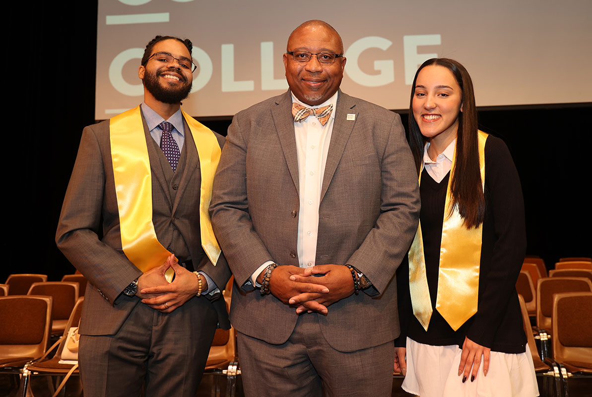 PHOTOS: (Above) President George Timmons, center, with student speakers Jamal Cumberbath and Sachelys Perez after the 2025 Fall Graduate Reception.