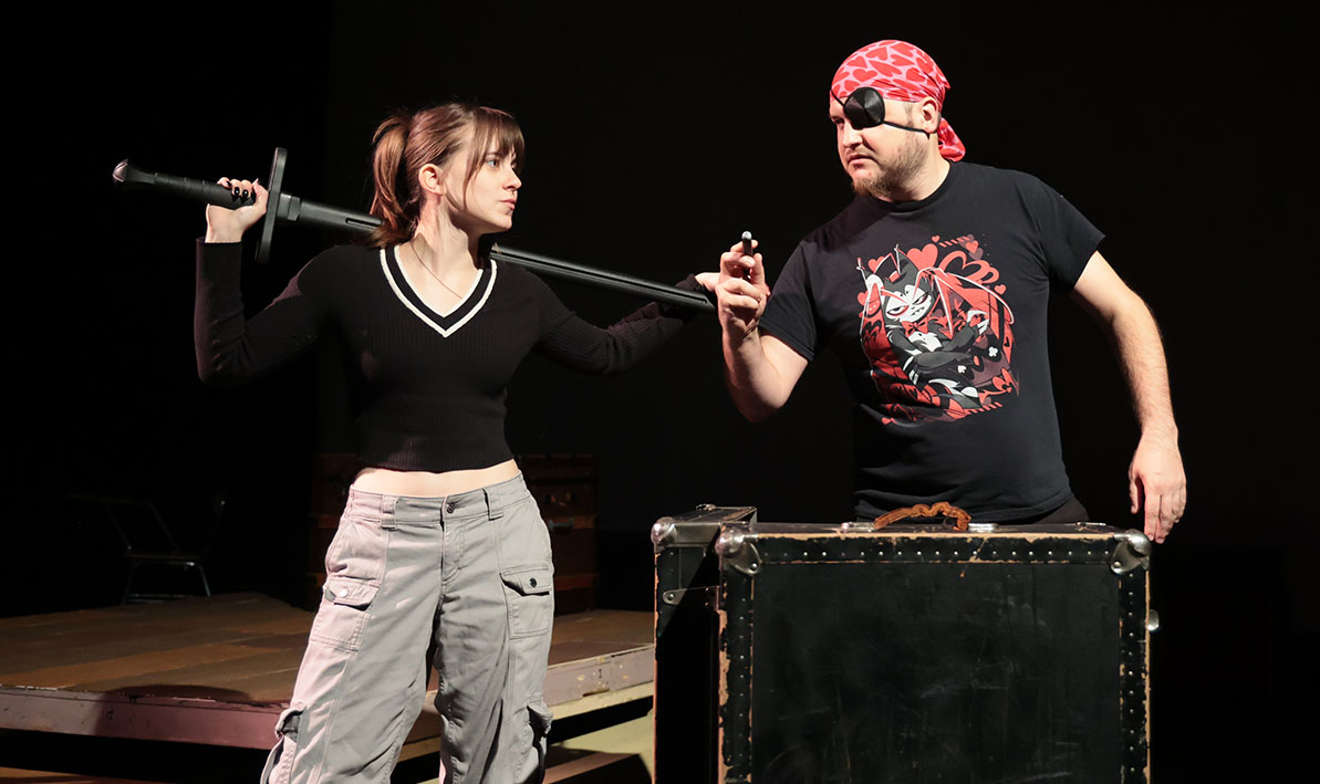 PHOTOS: (Thumbnail) Allison Morrissette, as Rose-of-Sharon Crutcher, and Zachary Ciano, as Throatpin, rehearse a scene from The Last Living Gun. (Above) Addi Hufnagle, as Angel Mouth, and Casey Castenir, as Wallace, play villains sent to disrupt Rose-of-Sharon's epic quest.