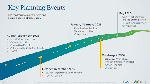 Strategic planning has become the cornerstone of how we advance our mission to Educate. Inspire. Connect. Our journey began in 2017 and continued in 2021 when we refreshed our plan amid pandemic disruptions and growing awareness of social justice issues. The resulting 2023-26 Strategic Plan reflected our evolution and deepened commitment to equity and student success. Now, we embark on Strategic Plan 3.0 under the leadership of President George Timmons, reflecting our commitment to ensuring that the transformative work we do every day continues to evolve and respond to our students and community. Strategic planning at HCC is how we honor our past achievements while boldly shaping our future.